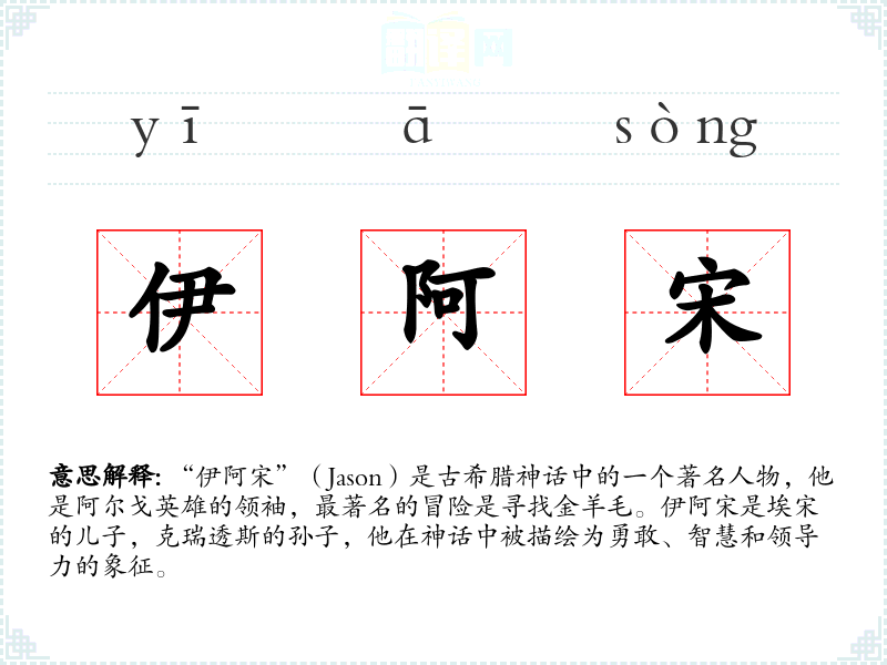 “伊阿宋”(Jason)是古希腊神话中的一个著名人物,他是阿尔戈英雄的领袖,最著名的冒险是寻找金羊毛。伊阿宋是埃宋的儿子,克瑞透斯的孙子,他在神话中被描绘为勇敢、智慧和领导力的象征。