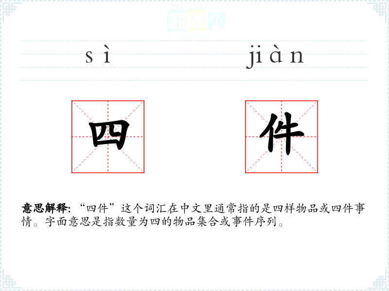 “四件”这个词汇的词源较为直接,由数字“四”和量词“件”组成,没有复杂的演变历史。在中文中,量词的使用非常丰富,而“件”作为一个常用的量词,用来计量衣物、物品等。