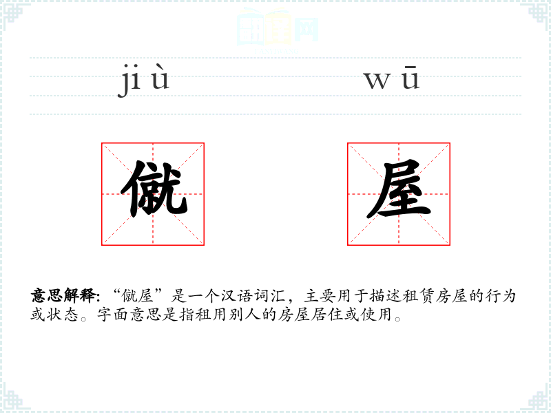 “僦屋”是一个汉语词汇,主要用于描述租赁房屋的行为或状态。字面意思是指租用别人的房屋居住或使用。