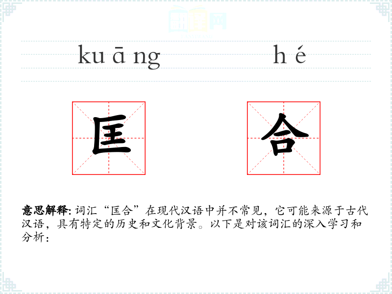 词汇“匡合”在现代汉语中并不常见,它可能来源于古代汉语,具有特定的历史和文化背景。以下是对该词汇的深入学*和分析: