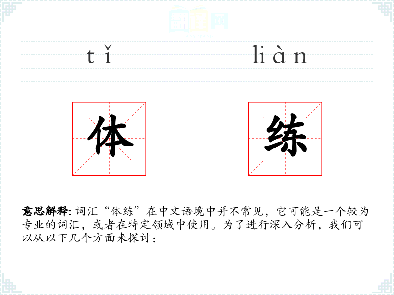 词汇“体练”在中文语境中并不常见,它可能是一个较为专业的词汇,或者在特定领域中使用。为了进行深入分析,我们可以从以下几个方面来探讨:
