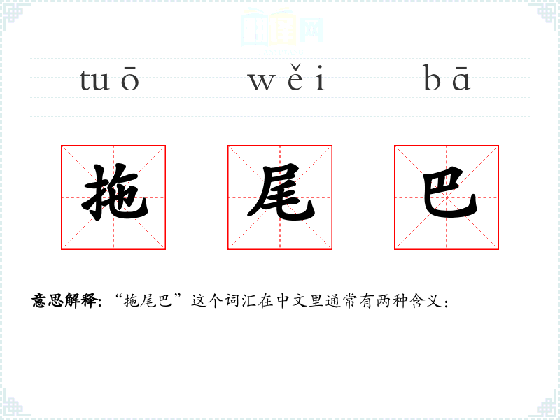 “拖尾巴”这个词汇的字面意思源自动物的行为,后来逐渐引申为比喻意义,用以描述人的行为特征。