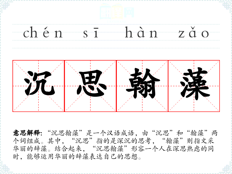 “沉思翰藻”是一个汉语成语,由“沉思”和“翰藻”两个词组成。其中,“沉思”指的是深沉的思考,“翰藻”则指文采华丽的辞藻。结合起来,“沉思翰藻”形容一个人在深思熟虑的同时,能够运用华丽的辞藻表达自己的思想。