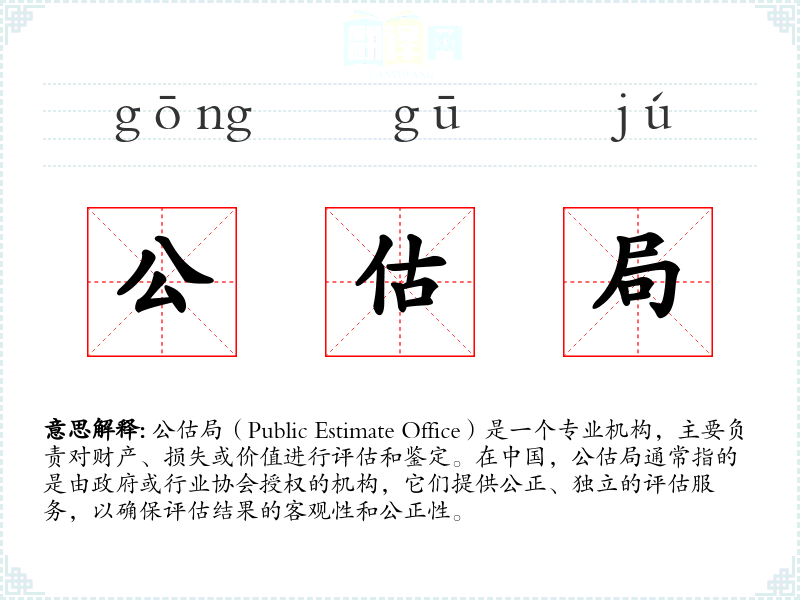 公估局(Public Estimate Office)是一个专业机构,主要负责对财产、损失或价值进行评估和鉴定。在中国,公估局通常指的是由政府或行业协会授权的机构,它们提供公正、独立的评估服务,以确保评估结果的客观性和公正性。