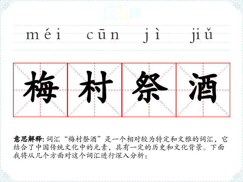 “梅村祭酒”这个词汇结合了“梅村”和“祭酒”两个词。其中,“梅村”可能源自古代对梅花的热爱和赞美,而“祭酒”则是古代祭祀文化的一部分。随着时间的推移,这个词汇可能被用来指代特定的文化活动或历史。