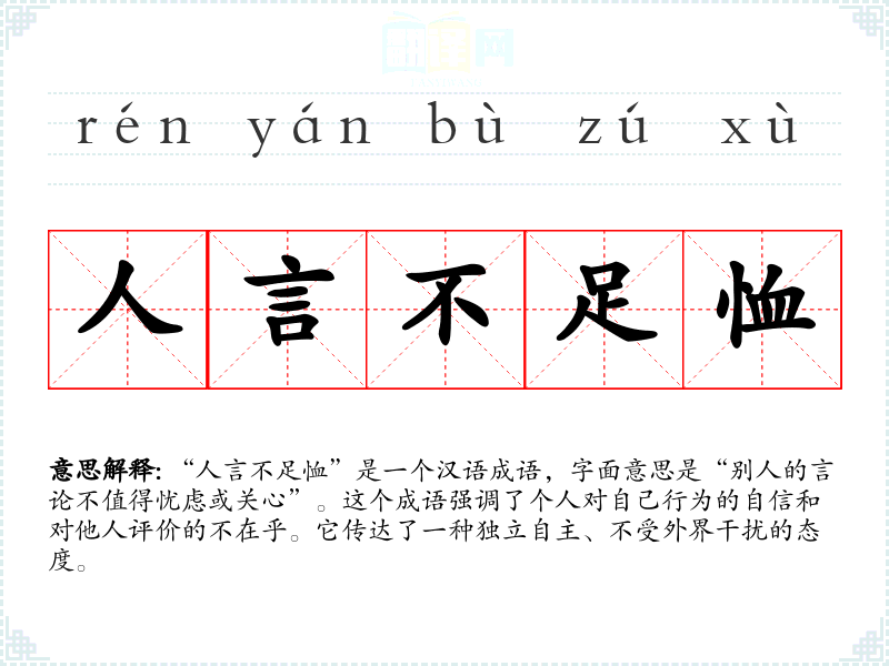 “人言不足恤”是一个汉语成语,字面意思是“别人的言论不值得忧虑或关心”。这个成语强调了个人对自己行为的自信和对他人评价的不在乎。它传达了一种独立自主、不受外界干扰的态度。