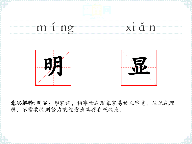 明显:形容词,指事物或现象容易被人察觉、认识或理解,不需要特别努力就能看出其存在或特点。