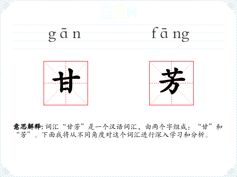 词汇“甘芳”是一个汉语词汇,由两个字组成:“甘”和“芳”。下面我将从不同角度对这个词汇进行深入学*和分析。