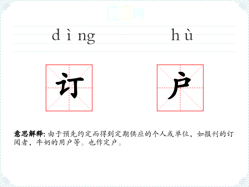 由于预先约定而得到定期供应的个人或单位,如报刊的订阅者,牛奶的用户等。也作定户。