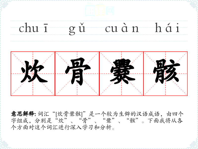 词汇“[炊骨爨骸]”是一个较为生僻的汉语成语,由四个字组成,分别是“炊”、“骨”、“爨”、“骸”。下面我将从各个方面对这个词汇进行深入学*和分析。