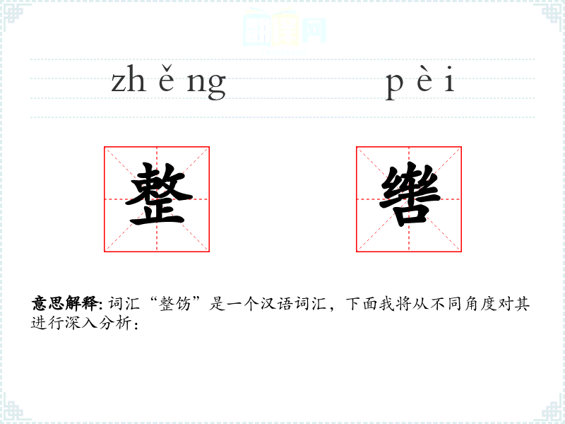 “整饬”字面意思是指整理、整顿,使其有序、整洁。基本含义是使事物变得有条理、规整,常用于形容对环境、物品或行为的整理和整顿。