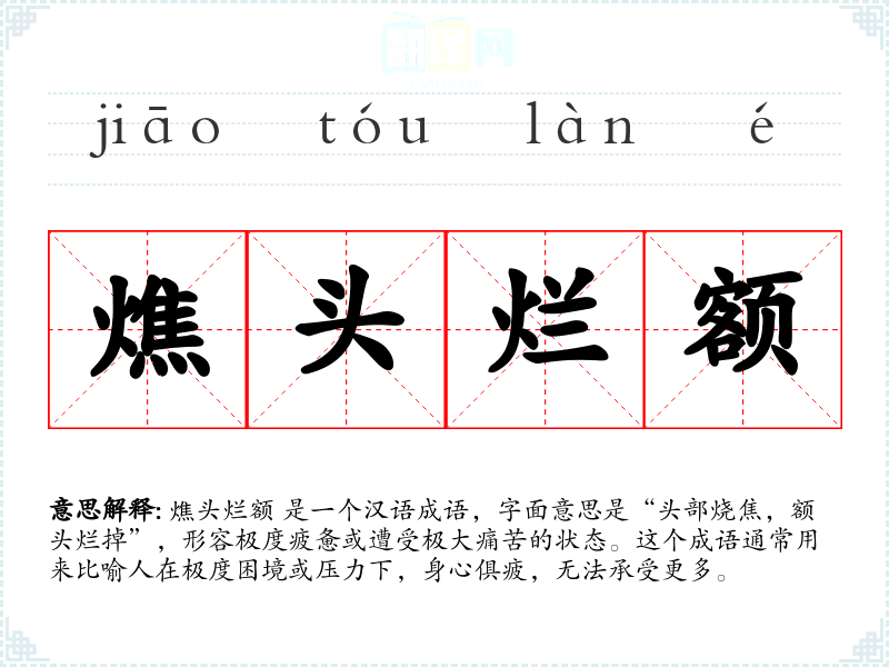 燋头烂额 是一个汉语成语,字面意思是“头部烧焦,额头烂掉”,形容极度疲惫或遭受极大痛苦的状态。这个成语通常用来比喻人在极度困境或压力下,身心俱疲,无法承受更多。