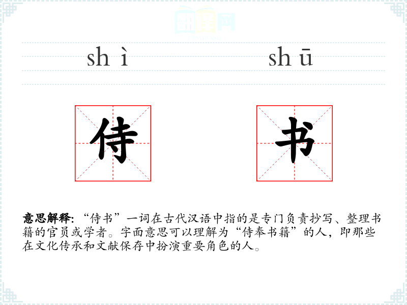 “侍书”一词在古代汉语中指的是专门负责抄写、整理书籍的官员或学者。字面意思可以理解为“侍奉书籍”的人,即那些在文化传承和文献保存中扮演重要角色的人。
