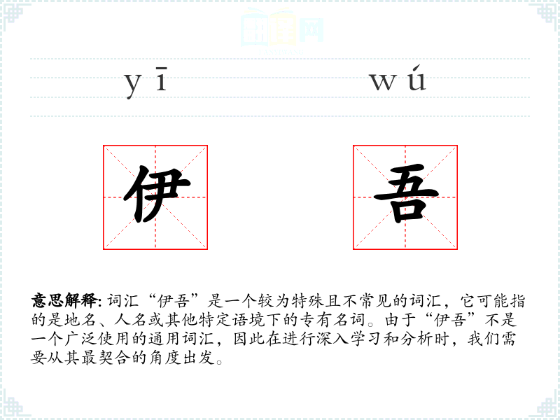 词汇“伊吾”是一个较为特殊且不常见的词汇,它可能指的是地名、人名或其他特定语境下的专有名词。由于“伊吾”不是一个广泛使用的通用词汇,因此在进行深入学*和分析时,我们需要从其最契合的角度出发。