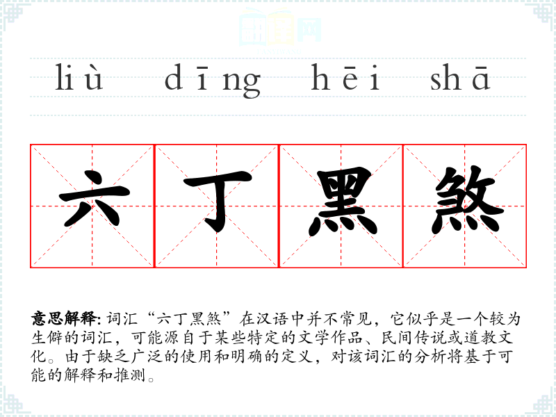 词汇“六丁黑煞”在汉语中并不常见,它似乎是一个较为生僻的词汇,可能源自于某些特定的文学作品、民间传说或道教文化。由于缺乏广泛的使用和明确的定义,对该词汇的分析将基于可能的解释和推测。
