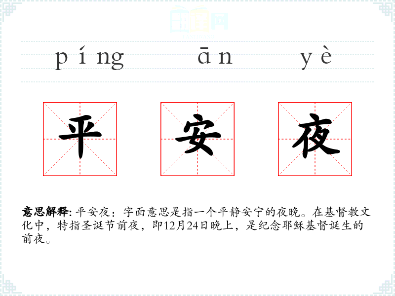 平安夜:字面意思是指一个平静安宁的夜晚。在教文化中,特指圣诞节前夜,即12月24日晚上,是纪念耶稣诞生的前夜。