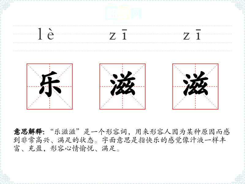 “乐滋滋”是一个形容词,用来形容人因为某种原因而感到非常高兴、满足的状态。字面意思是指快乐的感觉像汁液一样丰富、充盈,形容心情愉悦、满足。