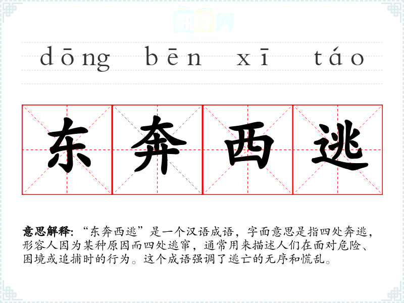 “东奔西逃”是一个汉语成语,字面意思是指四处奔逃,形容人因为某种原因而四处逃窜,通常用来描述人们在面对危险、困境或追捕时的行为。这个成语强调了逃亡的无序和慌乱。