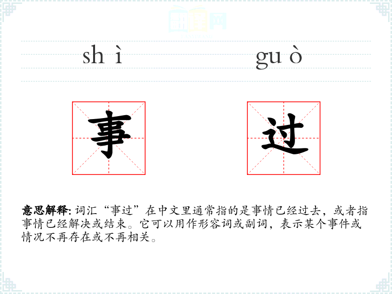 词汇“事过”在中文里通常指的是事情已经过去,或者指事情已经解决或结束。它可以用作形容词或副词,表示某个**或情况不再存在或不再相关。