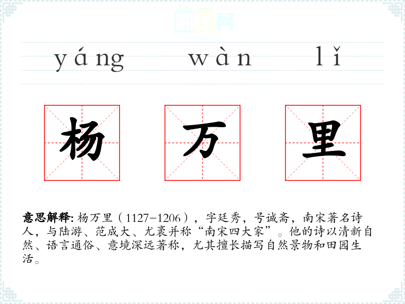 - 同义词:陆游、范成大、尤袤(均为南宋著名诗人,与杨万里并称“南宋四大家”)