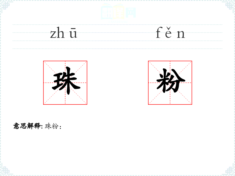 - 词源:珠粉一词源于“珍珠”和“粉”,珍珠是原料,粉表示其形态。