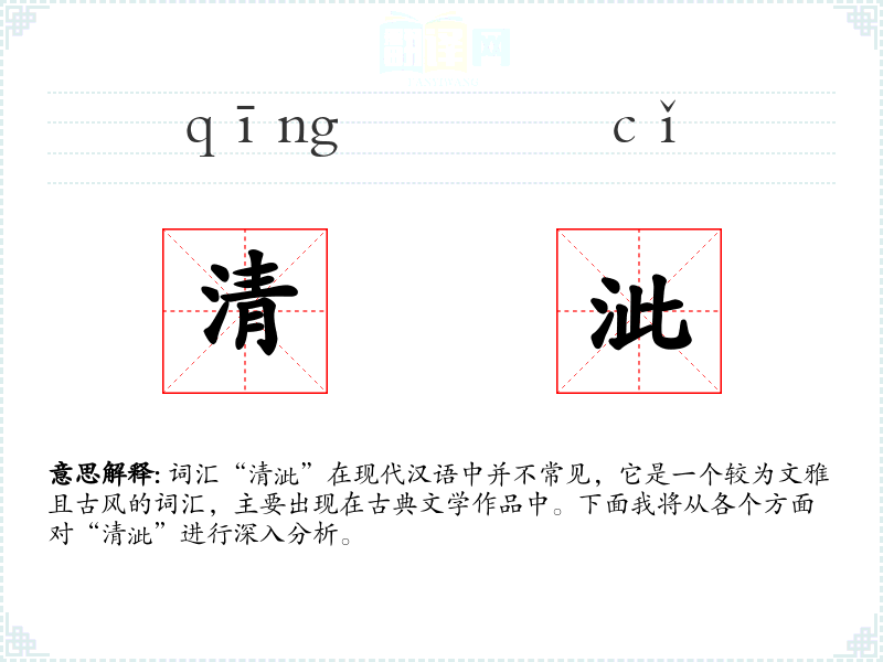 词汇“清泚”在现代汉语中并不常见,它是一个较为文雅且古风的词汇,主要出现在古典文学作品中。下面我将从各个方面对“清泚”进行深入分析。