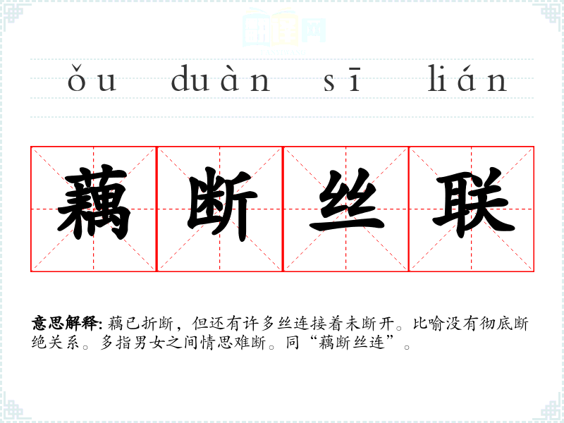 藕已折断,但还有许多丝连接着未断开。比喻没有彻底断绝关系。多指男女之间情思难断。同“