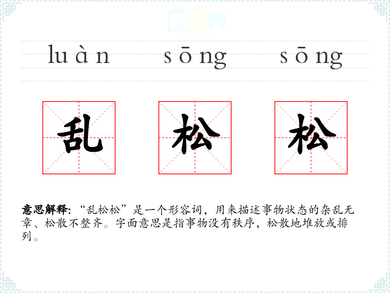 “乱松松”是一个形容词,用来描述事物状态的杂乱无章、松散不整齐。字面意思是指事物没有秩序,松散地堆放或排列。