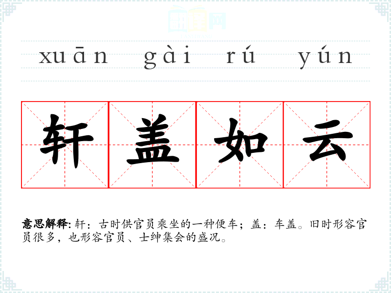 轩:古时供官员乘坐的一种便车;盖:车盖。旧时形容官员很多,也形容官员、士绅集会的盛况。