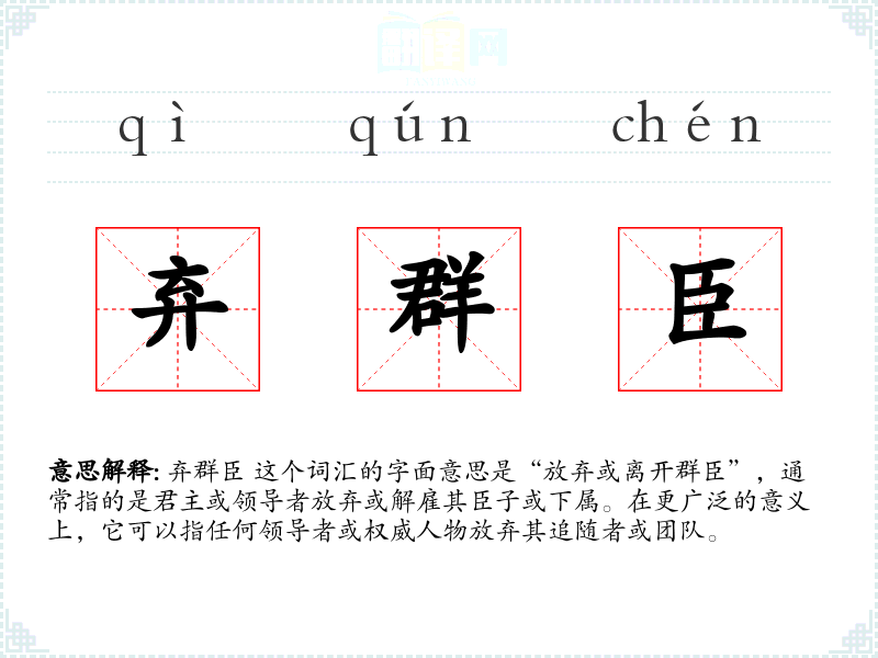 弃群臣 这个词汇源自古代汉语,其中“弃”意味着放弃或抛弃,“群臣”指的是一群臣子或下属。随着时间的推移,这个词汇的意义和用法在现代汉语中保持相对稳定。