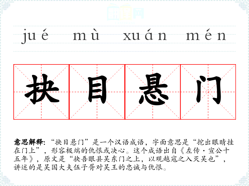 “抉目悬门”是一个汉语成语,字面意思是“挖出眼睛挂在门上”,形容极端的仇恨或决心。这个成语出自《左传·宣公十五年》,原文是“抉吾眼县吴东门之上,以观越寇之入灭吴也”,讲述的是吴国大夫伍子胥对吴王的忠诚与仇恨。