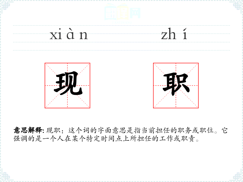 现职这个词由“现”和“职”两个字组成。“现”表示当前的、现在的,而“职”表示职务、职位。这个词在中文中的使用历史相对较短,主要在现代汉语中流行,特别是在描述职场和官方职务时。