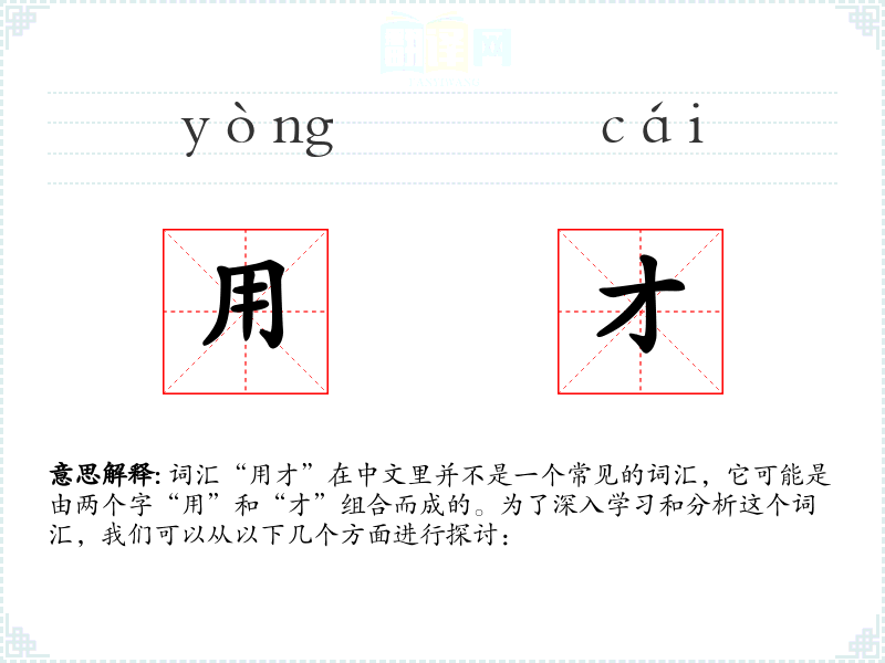 词汇“用才”在中文里并不是一个常见的词汇,它可能是由两个字“用”和“才”组合而成的。为了深入学*和分析这个词汇,我们可以从以下几个方面进行探讨: