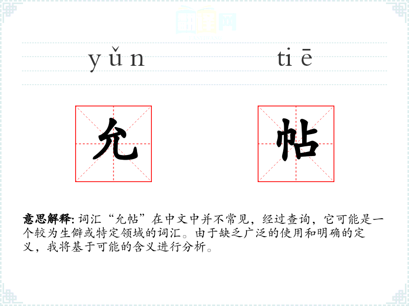 词汇“允帖”在中文中并不常见,经过查询,它可能是一个较为生僻或特定领域的词汇。由于缺乏广泛的使用和明确的定义,我将基于可能的含义进行分析。