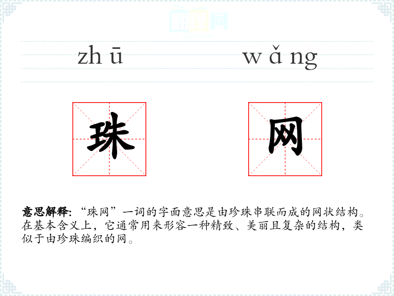 “珠网”一词的字面意思是由珍珠串联而成的网状结构。在基本含义上,它通常用来形容一种精致、美丽且复杂的结构,类似于由珍珠编织的网。