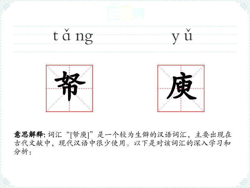 词汇“[帑庾]”是一个较为生僻的汉语词汇,主要出现在古代文献中,现代汉语中很少使用。以下是对该词汇的深入学*和分析: