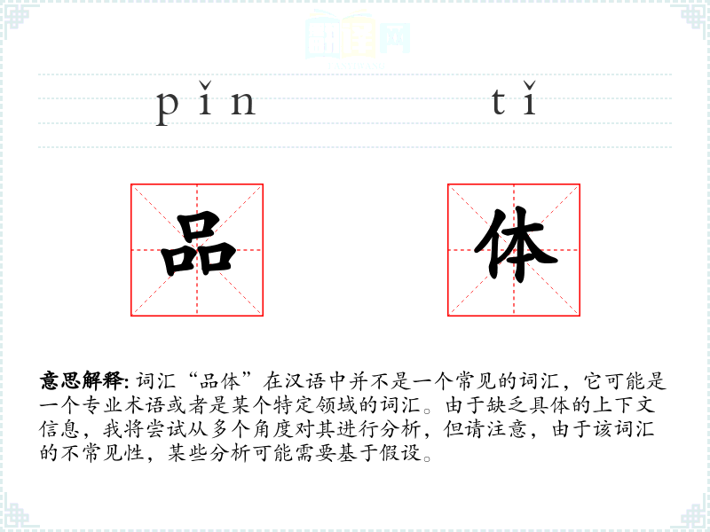 词汇“品体”在汉语中并不是一个常见的词汇,它可能是一个专业术语或者是某个特定领域的词汇。由于缺乏具体的上下文信息,我将尝试从多个角度对其进行分析,但请注意,由于该词汇的不常见性,某些分析可能需要基于假设。