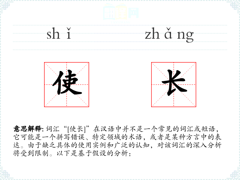 综上所述,由于“[使长]”不是一个已知的词汇,对其的深入分析受到限制。如果这是一个特定领域的术语或方言表达,可能需要更多的上下文信息来进行准确的分析。