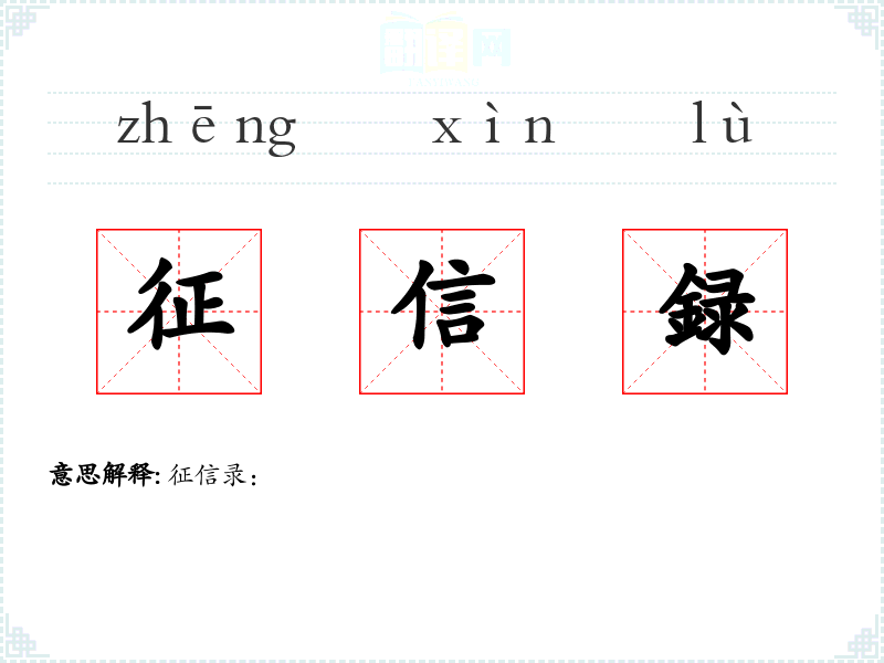 - 字面意思:由“征信”和“录”两个词组成。“征信”指的是收集和评估个人或企业的信用信息,而“录”通常指记录或记载。