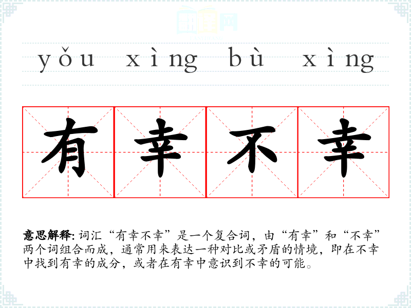 词汇“有幸不幸”是一个复合词,由“有幸”和“不幸”两个词组合而成,通常用来表达一种对比或矛盾的情境,即在不幸中找到有幸的成分,或者在有幸中意识到不幸的可能。
