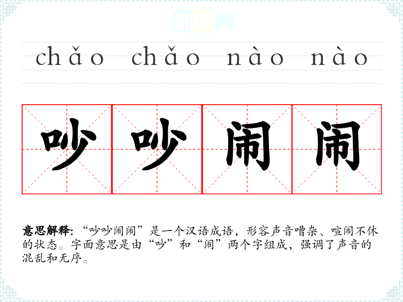 “吵吵闹闹”是一个汉语成语,形容声音嘈杂、喧闹不休的状态。字面意思是由“吵”和“闹”两个字组成,强调了声音的混乱和无序。