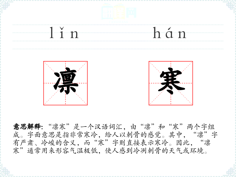 “凛寒”是一个汉语词汇,由“凛”和“寒”两个字组成。字面意思是指非常寒冷,给人以刺骨的感觉。其中,“凛”字有严肃、冷峻的含义,而“寒”字则直接表示寒冷。因此,“凛寒”通常用来形容气温极低,使人感到冷冽刺骨的天气或环境。