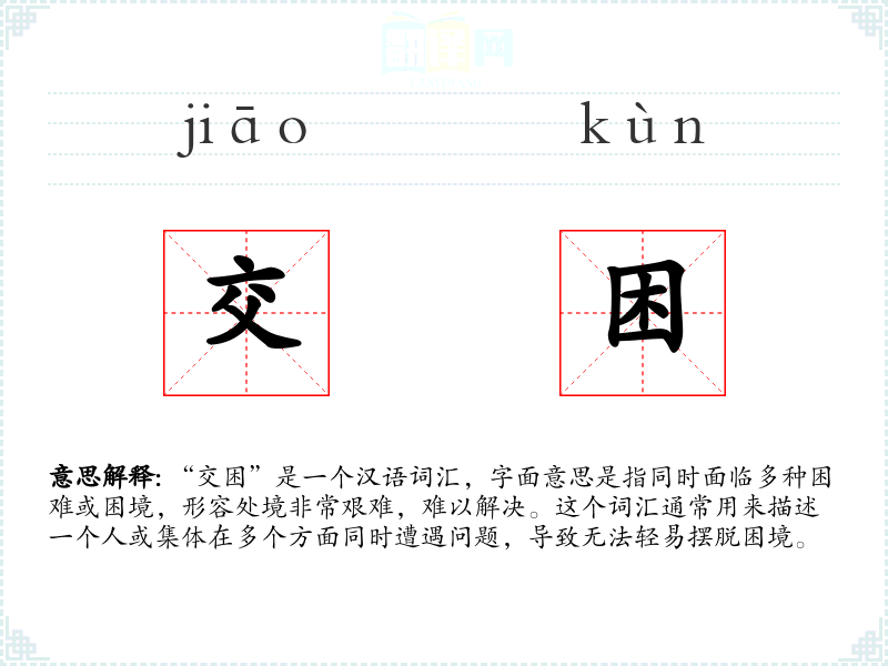 “交困”是一个汉语词汇,字面意思是指同时面临多种困难或困境,形容处境非常艰难,难以解决。这个词汇通常用来描述一个人或集体在多个方面同时遭遇问题,导致无法轻易摆脱困境。