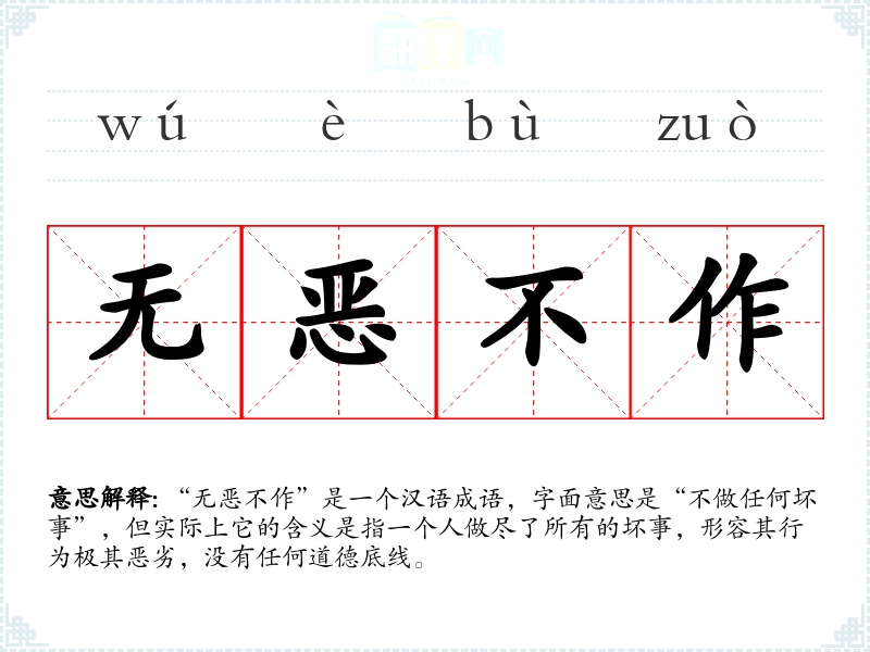 “无恶不作”是一个汉语成语,字面意思是“不做任何坏事”,但实际上它的含义是指一个人做尽了所有的坏事,形容其行为极其恶劣,没有任何道德底线。