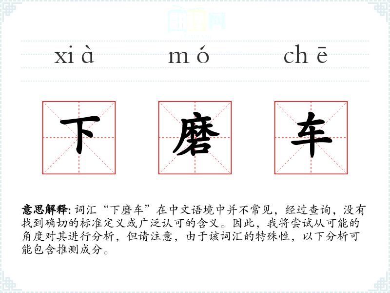 由于“下磨车”不是一个标准词汇,我们无法提供确切的基本定义。但从字面意思来看,“下”可能表示动作的进行或位置的降低,“磨车”可能指的是一种与磨相关的车辆或机械设备。