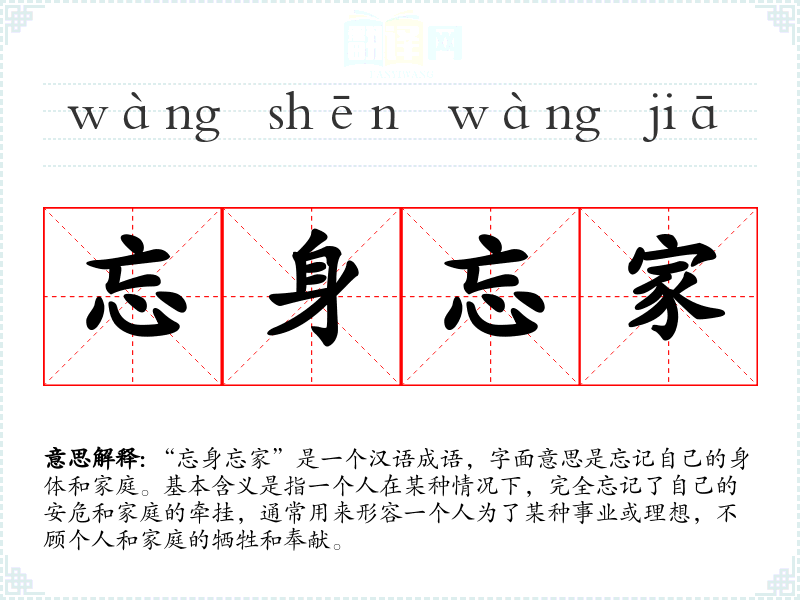在文学作品中,“忘身忘家”常用来形容英雄人物或志士仁人在追求正义、理想或国家大事时的无私奉献。在口语中,这个成语可能用来形容某人过于专注于某项工作或活动,以至于忽略了家庭和个人生活。在专业领域,如历史学或政治学,这个成语可能用来分析和评价历史人物的牺牲精神。