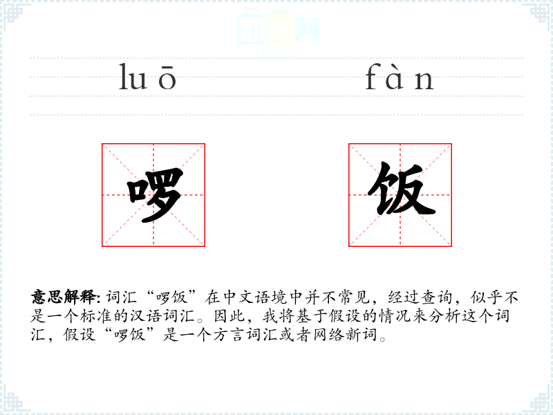 词汇“啰饭”在中文语境中并不常见,经过查询,似乎不是一个标准的汉语词汇。因此,我将基于假设的情况来分析这个词汇,假设“啰饭”是一个方言词汇或者网络新词。