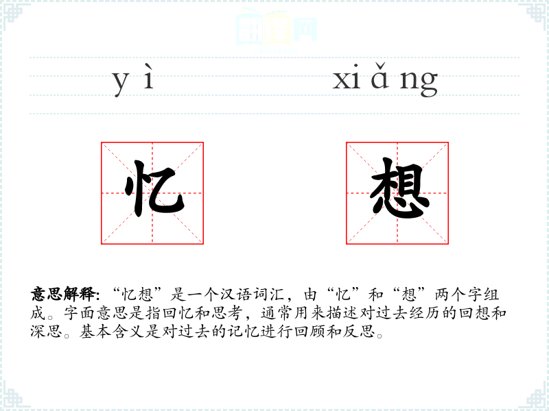 通过对“忆想”的深入学,我更加理解了它在表达怀旧和反思时的重要性。在语言学和表达中,掌握这样的词汇能够丰富我的情感表达和思维深度。