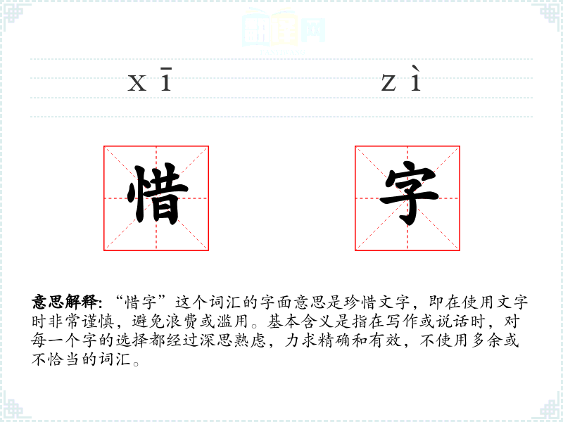 “惜字”这个词汇的字面意思是珍惜文字,即在使用文字时非常谨慎,避免浪费或滥用。基本含义是指在写作或说话时,对每一个字的选择都经过深思熟虑,力求精确和有效,不使用多余或不恰当的词汇。