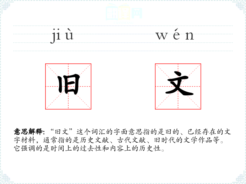 “旧文”这个词汇的字面意思指的是旧的、已经存在的文字材料,通常指的是历史文献、古代文献、旧时代的文学作品等。它强调的是时间上的过去性和内容上的历史性。